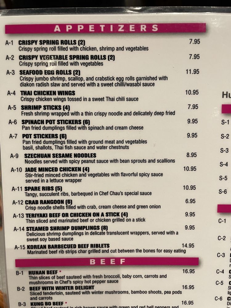 “ We stopped in for dinner as a group of three at 6:30pm after we had made a reservation earlier in the day. They have a small parking lot, but we were able to get a spot no problem. We were welcomed in and given a table in the middle of the restaurant. The place settings were really cute and when we ordered tea and our cups matched as well. They had a Summer Specials menu as well as a pretty extensive regular menu. We ordered a couple egg rolls and potstickers as appetizers and the Bangkok Duck, Mala String Beans and Zucchini and Fresh mushrooms as our entrees to share. We enjoyed our appetizers first and the entrees came out shortly after. Everything was tasty and we noticed the vegetables were really fresh. They have the option of mild, medium or spicy for many items and we ordered the Mala string beans spicy and they only had a hint of heat. They were really flavorful though and we were fine with them not being on the spicier side. While we were there they filled our waters and checked in on us frequently. We also noticed a few groups celebrating birthdays and enjoying family dinners. It was definitely a family friendly spot. ”